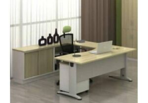 L-shaped office desk with storage cabinet. Spacious and ergonomic design.