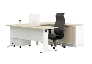L-shaped office desk with storage cabinet. Spacious and ergonomic design.
