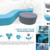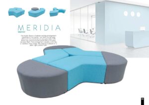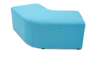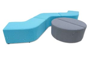 The model features a modular seating arrangement, specifically the Spacesti Modular Cubes Wavy Reception Seating or Spacesti Modular Cubes Wavy Lobby Seat. It consists of several pieces: a wavy, serpentine-shaped seating element in a bright blue fabric and a round, two-part ottoman in a gray fabric. The modular design suggests flexibility in arrangement and use, suitable for reception areas, lobbies, or collaborative spaces.