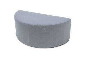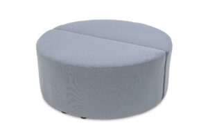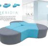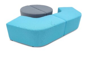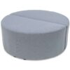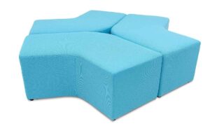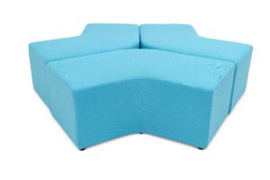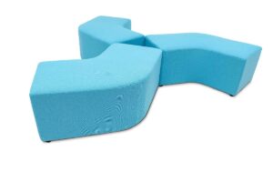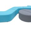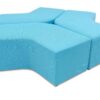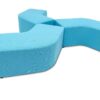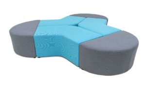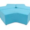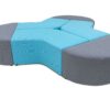 The model shows a modular seating arrangement consisting of five pieces. Two semi-circular grey ottomans are positioned on opposite sides, with three blue, puzzle-shaped pieces filling the gaps between them. The arrangement creates a star-like or abstract floral shape. The seating is placed on a plain, light-colored floor.