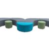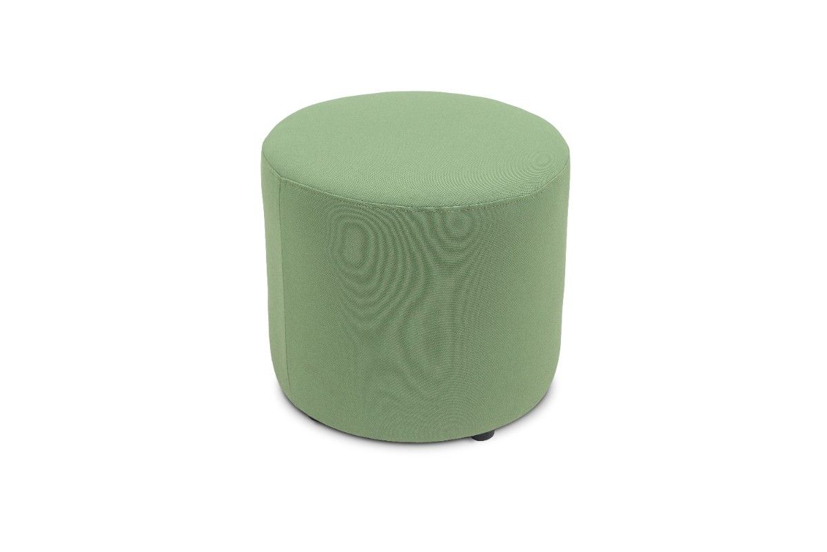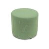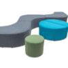 There are also three cylindrical ottomans, two in light green and one larger, round ottoman in blue (appears split into two halves).